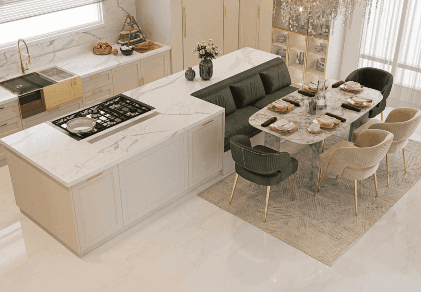 - A kitchen island with a built-in banquette
